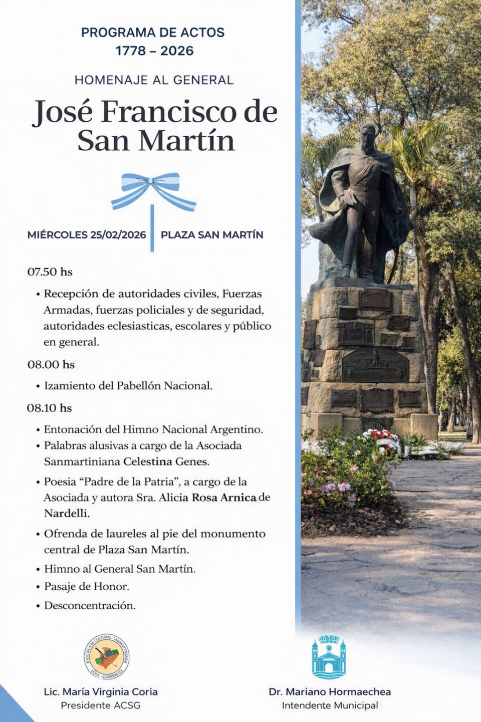La Municipalidad de Goya y la Asociación Cultural Sanmartiniana invitan al acto conmemorativo del nacimiento del general José Francisco de San Martín. El mencionado acto se realizará el Miércoles 25 de Febrero en la plaza que perpetúa la memoria del Libertador de América.