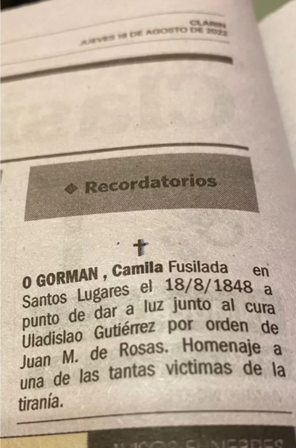 El diario porteño Clarín publicó este miércoles un aviso fúnebre que recuerda a la joven Camila O’ Gorman, quien se refugió en la localidad correntina de Goya, fue descubierta y luego fusilada por el gobierno de Juan Manuel de Rosas el 18 de agosto de 1848.