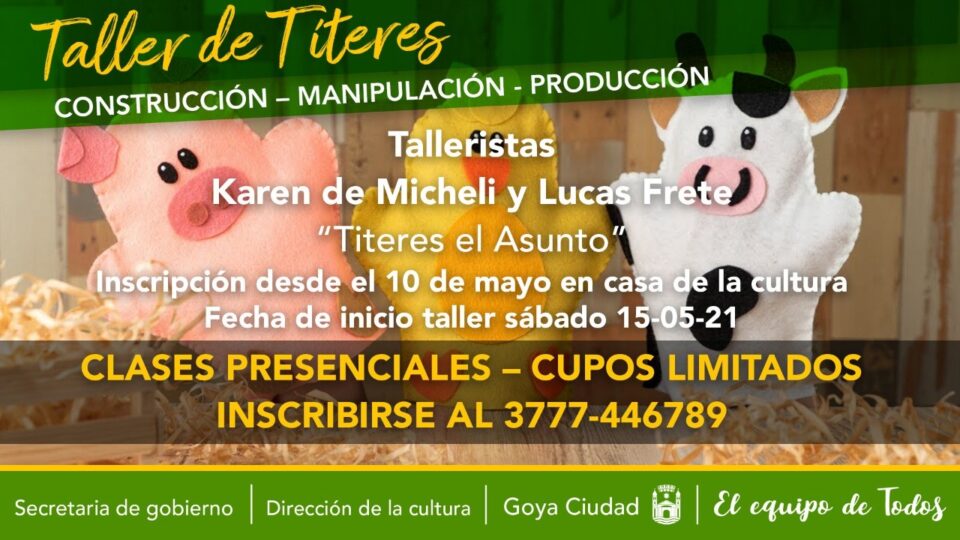 El Coordinador de la Escuela de Teatro, Javier Camino, indicó: “Quedan pocos cupos para este taller de títeres, se aprenderá a la construcción de títeres, para ser manipulados, la escritura y guión de títeres y por el mes de julio haremos un montaje de escena con nuestros propios títeres”.