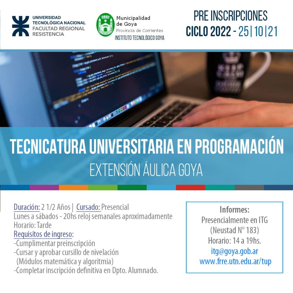 El instituto Tecnológico Goya informa que se encuentra abierta la preinscripción a la Tecnicatura Universitaria en Programación accediendo al siguiente link