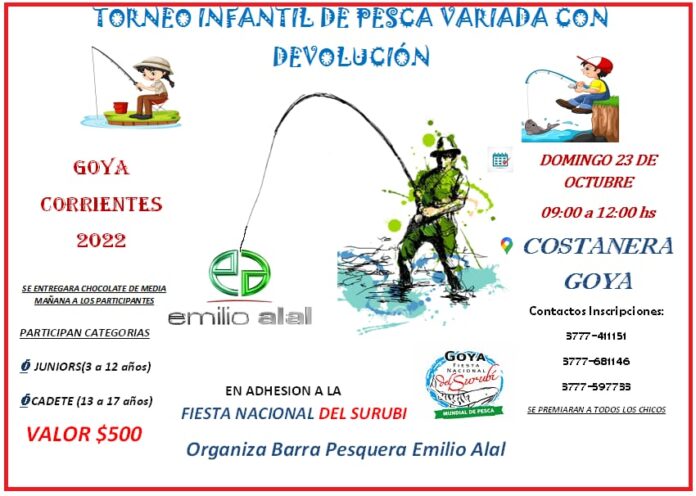El Concurso Infantil de Pesca de Costa variada con devolución se realizará este domingo 23 de octubre en Costanera de 9 a 12:00. El evento está organizado por la Barra Pesquera Emilio Alal y la colaboración de la Municipalidad de Goya.