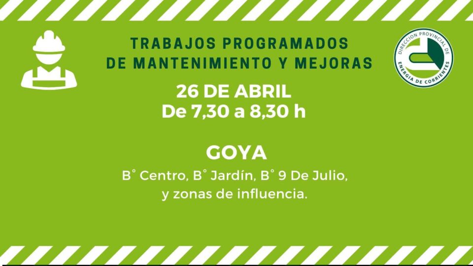La Dirección Provincial de Energía de Corrientes, informa que con motivo de realizar mejoras en el servicio, se interrumpirá el suministro de energía eléctrica en la ciudad, el Domingo 26 de 07:30 a 08:30, en los barrios Centro, Jardín, y 9 de Julio.