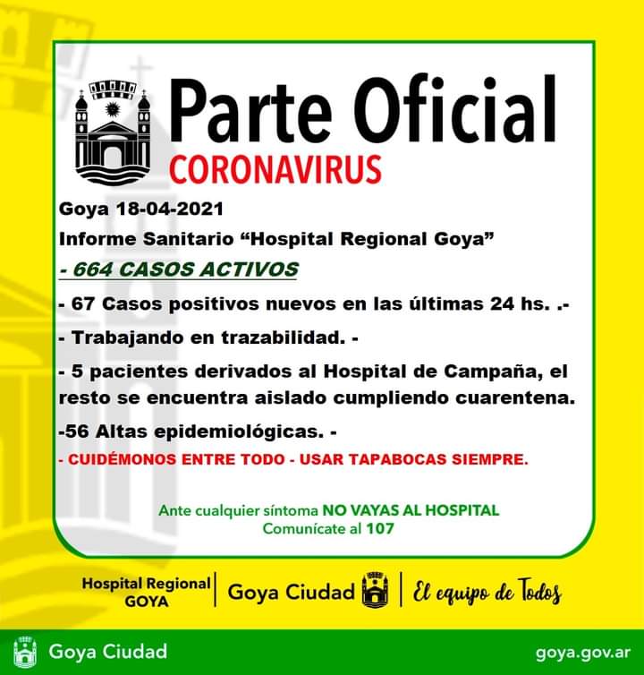 La segunda ciudad de la provincia registra un total de 664 casos activos de Covid-19. Este domingo el Hospital Regional informó 67 nuevos casos positivos de Covid-19. Fueron 5 los pacientes derivados al Hospital de Campaña ubicado en la ciudad Corrientes y se otorgaron 56 altas epidemiológicas.