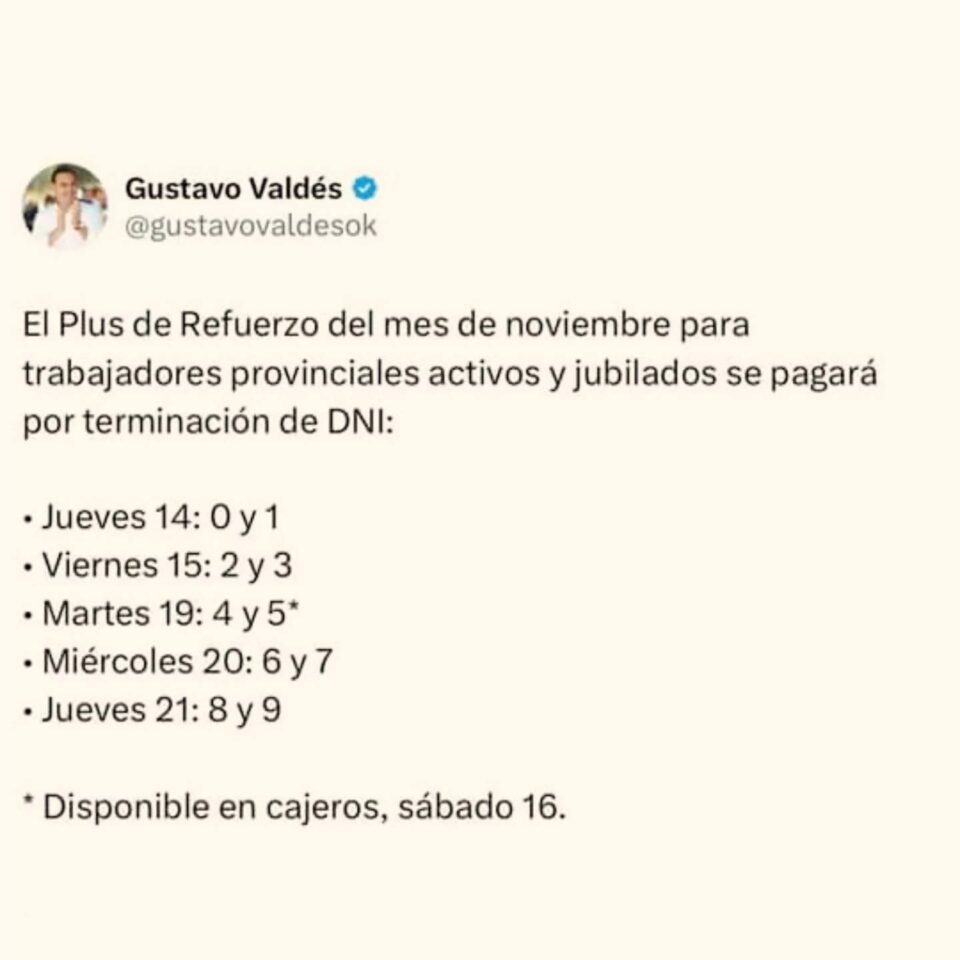 El gobernador Gustavo Valdés anunció a través de sus redes sociales el pago del plus de refuerzo para estatales de Corrientes. Comienza el Jueves 14 para DNI terminados en 0 y 1.