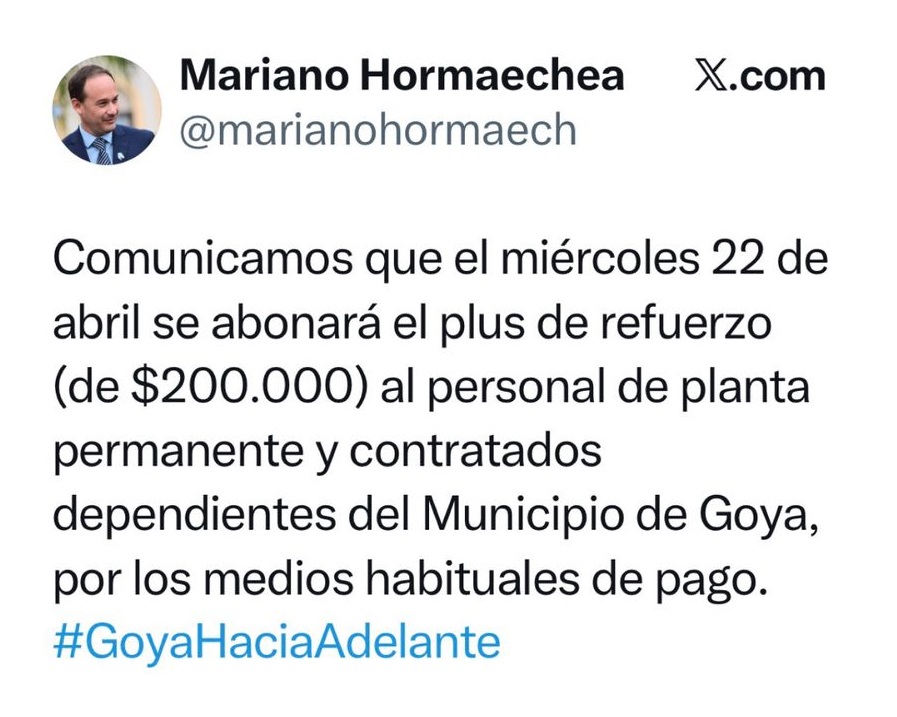El Intendente de Goya Mariano Hormaechea, informó que este mMiércoles 22 de Abril la comuna local abonará a todo el personal de Planta Permanente y Contratados el Plus de Refuerzo de 200 mil pesos por los canales habituales de pago.