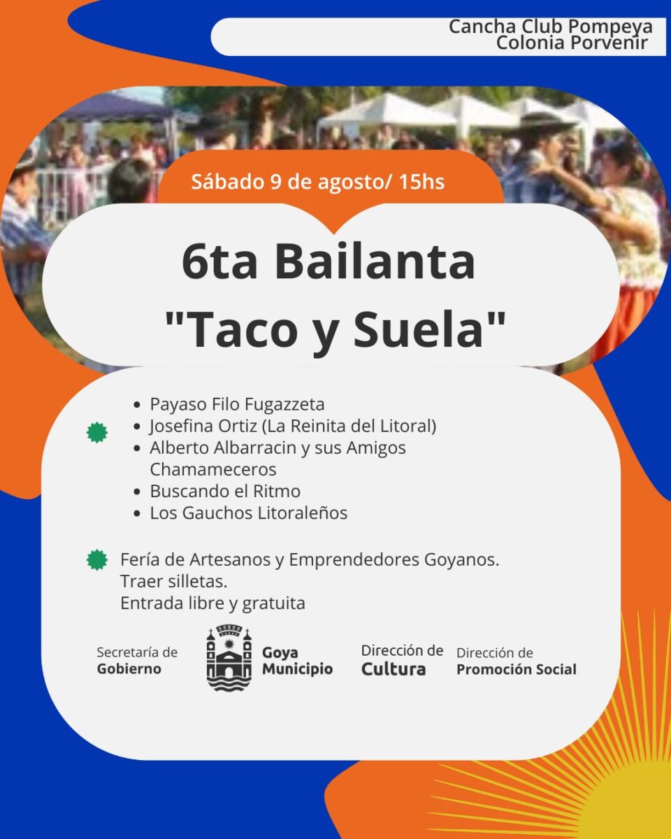 La Municipalidad de Goya invita a toda la comunidad a vivir una tarde a pura fiesta con la 6ª Bailanta “Taco y Suela”, que se realizará este Sábado 9 de Agosto a partir de las 15 horas, en la cancha del Club Pompeya, ubicada en la Primera Sección de Colonia Porvenir.