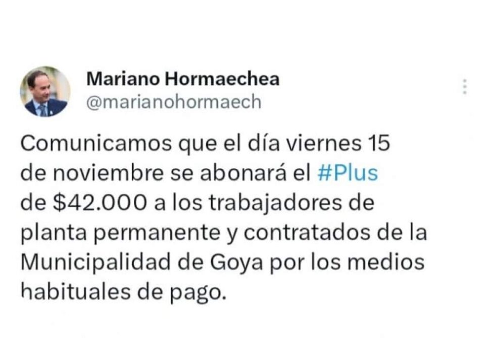 El intendente de Goya anunció a través de sus redes personales que este Viernes 15 de Noviembre se abonará el Plus de $42.000 pesos al personal de planta permanente y contratados dependientes del municipio y se verán reflejados en los medios habituales de pago.