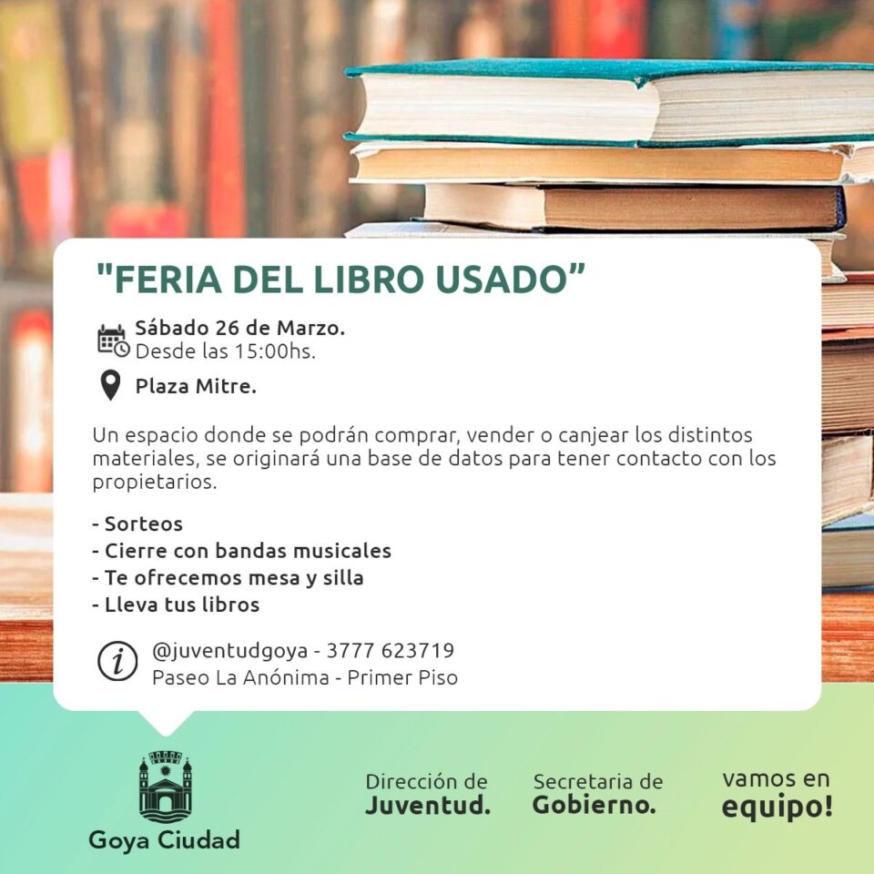 Este sábado 26 de marzo en plaza Mitre se habilitará la Feria del Libro Usado, desde las 16 hs. La propuesta cultural es organizada por la Dirección de Juventud en un espacio que servirá para comprar, vender, intercambiar, canjear los materiales de estudios, y conformar una base de datos de los propietarios de los textos de la Feria, para establecer contacto.