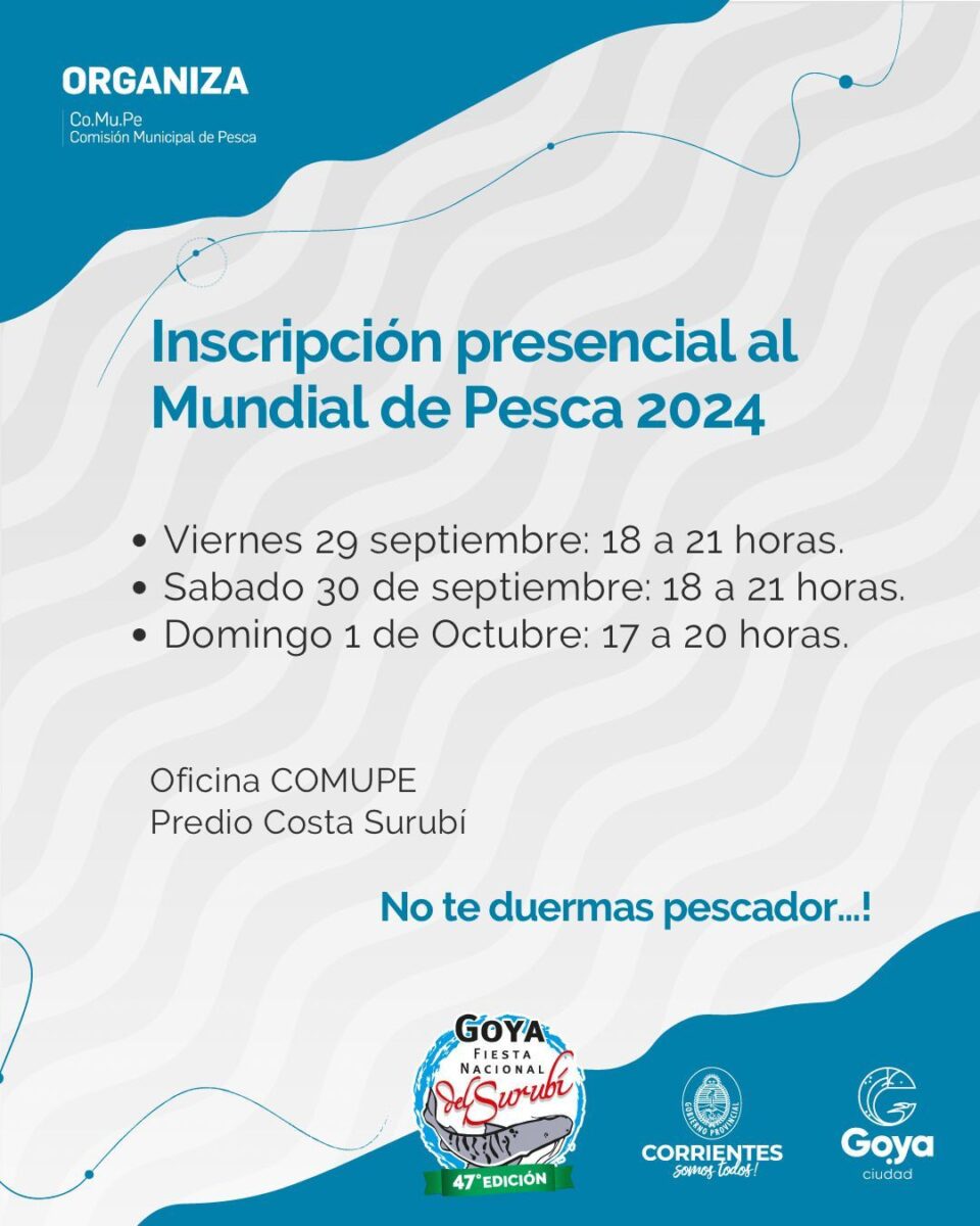 En el marco de la expo del Concurso Argentino de Pesca Variada, la Comisión Municipal de Pesca a través de sus equipos competentes estará presente ofreciendo la posibilidad a los equipos visitantes y locales de poder concretar su inscripción al Mundial de Pesca de manera presencial, realizar carga de datos, consultas en mesa de ayuda y los medios para formalizar pagos, en los siguientes días y horarios: