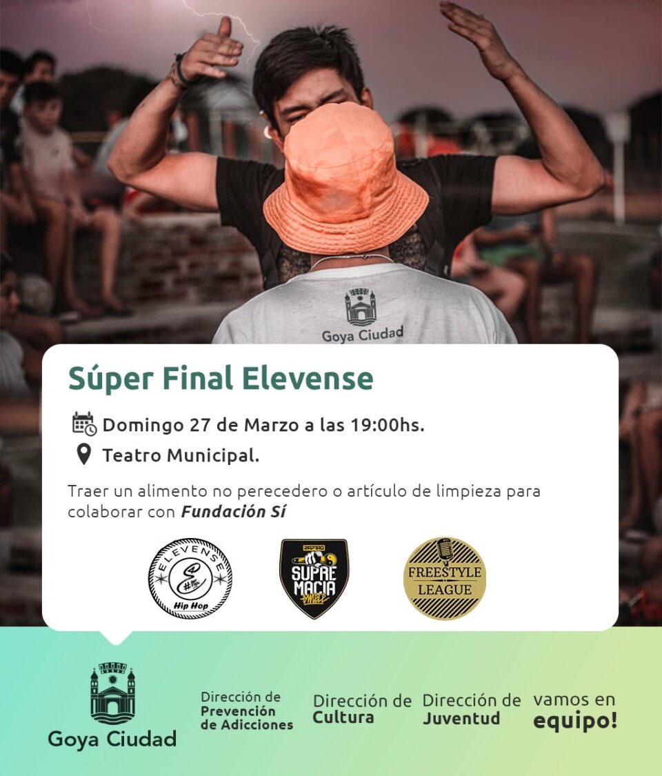 Este domingo 27 de marzo desde las 19 hs. vuelve a nuestra ciudad los mejor del Freestyle con un evento imperdible en el Teatro Municipal. La Municipalidad de Goya, a través de las Direcciones de Juventud, Cultura y Prevención de Adicciones te propone la Súper Final Elevense con batallas imperdibles.