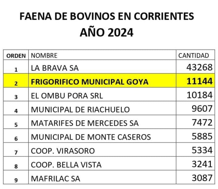 En relación a los datos de faenamiento del 2024, se desprenden los siguientes números de faenas, La Brava SA 43.268; Frigorífico Municipal de Goya 11.114; El Ombú Pora SRL 10.184; Municipal de Riachuelo 9.607; Matarifes de Mercedes SA 7.472; Municipal de Monte Caseros 5.885; Cooperativa Virasoro 5.334; Cooperativa Bella Vista 3.241; Mafrilac SA 3.087.