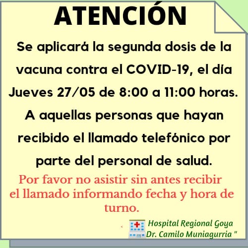 La segunda dosis se aplicará este jueves 27 en el Hospital Regional Goya, de 8 a 11 horas, y desde las 12 disponible para descargar turno para la colocación de la segunda dosis de la vacuna: Covishield.