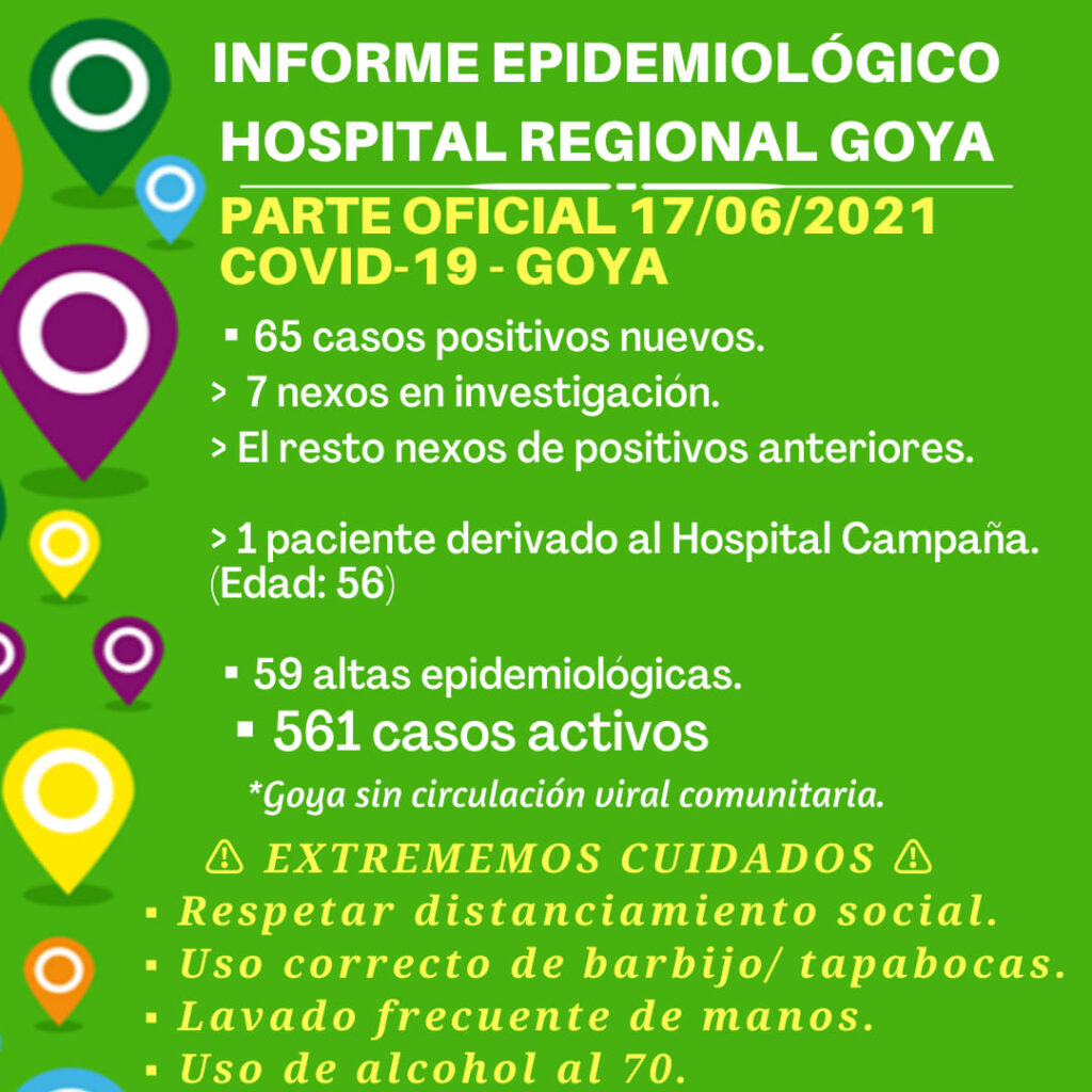 Son 65 los nuevos casos detectados durante este jueves y totaliza 561 los casos activos de coronavirus en la ciudad. Una persona de 56 años de edad fue trasladado al Hospital de Campaña. Se continúan realizando diariamente hisopados voluntarios y gratuitos.