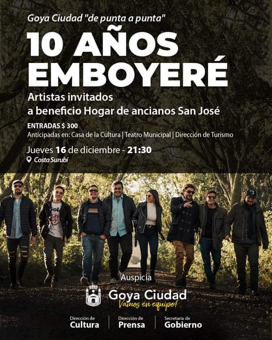 Este jueves EMBOYERE festeja sus 10 años con una actuación en Costa Surubí, la cual tiene una mirada benéfica pues parte de la recaudación estará destinada al Hogar de Ancianos “San José”. Las entradas tienen un valor de 300 pesos y se pueden adquirir en la Dirección de Turismo, en el Teatro Municipal y en Casa de la Cultura.