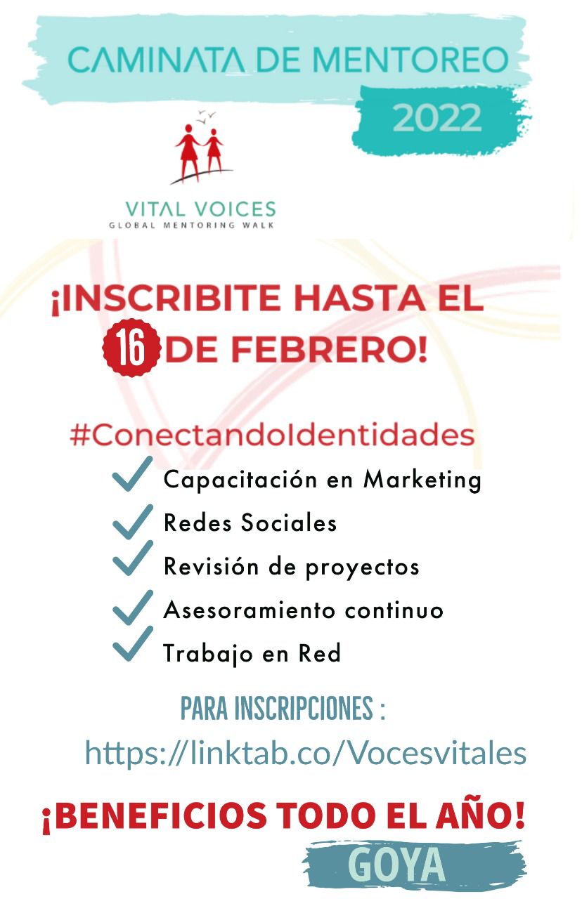 El plazo de inscripción vence este miércoles 16 de febrero. Los interesados deberán ingresar en la siguiente dirección https://linktab.co/Vocesvitales. Para mayor información también podes ingresar a las siguientes páginas https://bit.ly/3fEyOnG y www.vocesvitales.org.ar y seguir las redes sociales: @VocesVitalesconosur, donde también estará disponible el formulario de inscripción.
