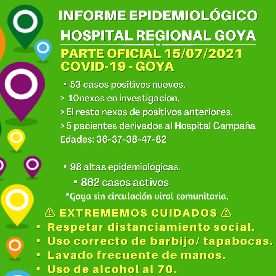 Este jueves 15 de julio el Hospital Regional informó que se detectaron 53 nuevos casos de covid-19 en la ciudad de Goya. El total de personas que transitan por esta enfermedad es de 862 goyanos.