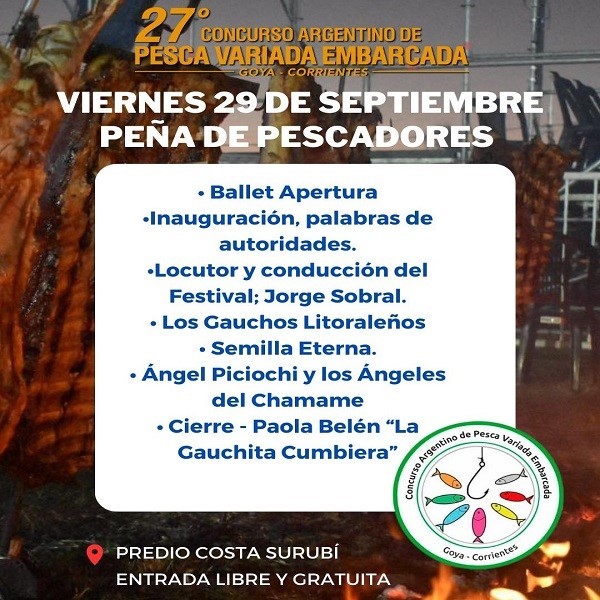 Este fin de semana, la ciudad de Goya se prepara para recibir a pescadores y amantes de la pesca en el marco del 27° Concurso Argentino de Pesca Variada Embarcada con Devolución. El evento se llevará a cabo desde el viernes hasta el domingo en el predio Costa Surubí, con entrada libre y gratuita para todos los interesados.
