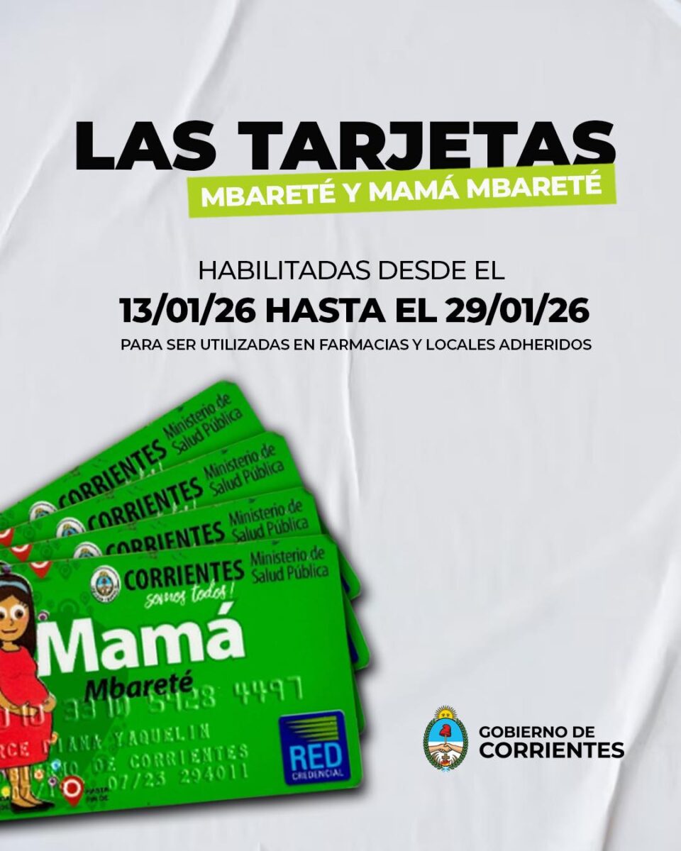 El Gobierno provincial, a través del Ministerio de Salud Pública a cargo de Emilio Lanari Zubiaur, comunica que las tarjetas Mbareté y Mamá Mbareté se encuentran habilitadas desde el 13 de Enero hasta el 29 de Enero, para ser utilizadas por los beneficiarios de las mismas.