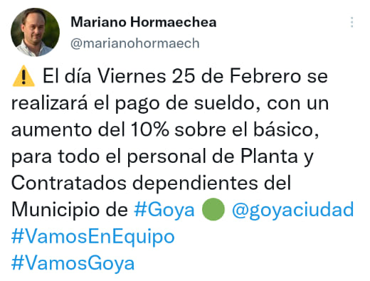 El Intendente Municipal de Goya, Mariano Hormaechea, utilizando sus redes sociales oficiales, adelantó que este viernes 25 de febrero se pagará el sueldo del mes de febrero con un aumento del 10 % sobre el básico a todo el personal de Planta y Contratados de la Municipalidad de Goya.