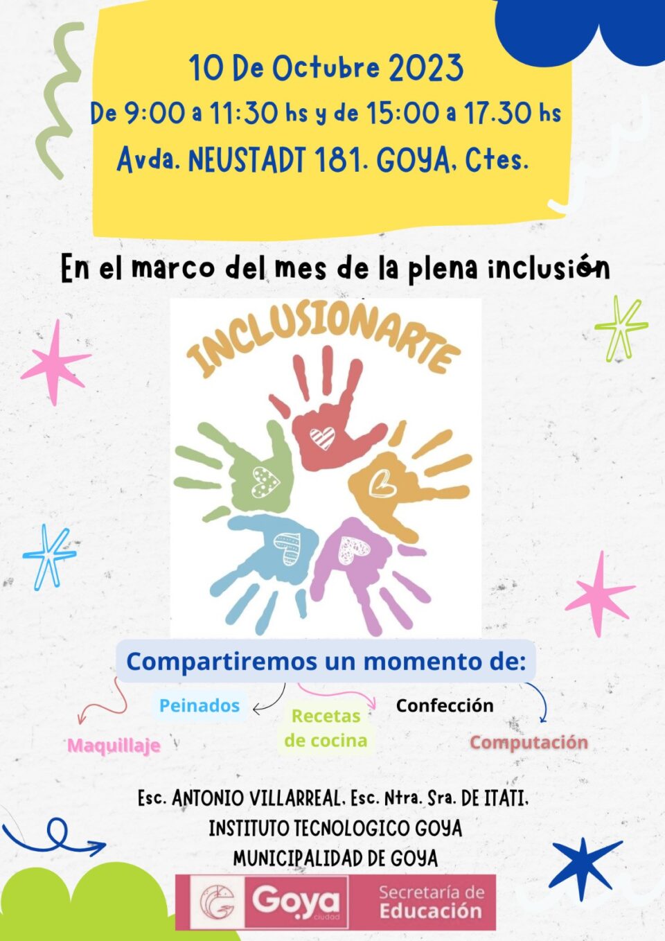 En el marco del mes de la plena inclusión, la Municipalidad de Goya a través de la Secretaría de Educación compartirá entre las Escuelas “Antonio Villarreal” y “Ntra. Sra. de Itati” y el Instituto Tecnológico Goya, actividades varias en Avda. Neustadt 181.
