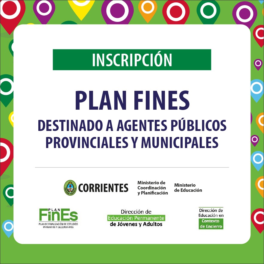 La Secretaría de Modernización, Innovación, Desarrollo Tecnológico y Educación, a cargo del Dr. Diego Goral a través de la Dirección de Educación, que dirige la Lic. Laura Segovia, informa que se encuentra abierta la inscripción a Plan Fines para Empleados Públicos. Esta iniciativa del Gobierno de Corrientes permitirá que los trabajadores del Estado, tanto provincial como de los distintos municipios, que no hayan completado el sistema educativo formal, puedan terminar tanto la primaria como la secundaria. Los interesados pueden acceder al siguiente link: