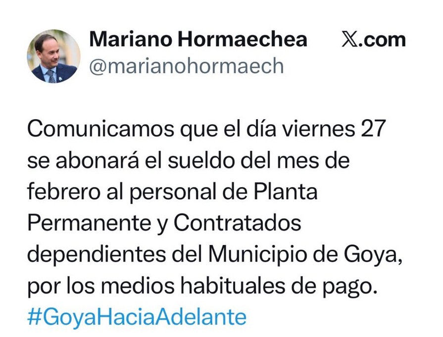 El intendente de Goya, anunció que este Viernes 27 de Febrero el personal de planta permanente y contratados dependientes del municipio percibirá el sueldo del mes de Febrero y se verán reflejados en los medios habituales de pago.