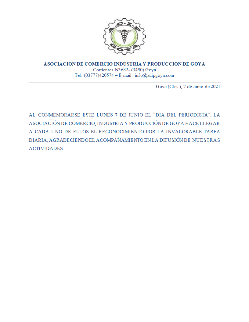 NoticiasLa Asociación de Comercio de Goya destaca la labor de periodista y envía afectuoso saludo 7 junio, 2021 Lo hizo a través de un comunicado, expresando agradecimiento por la difusión de actividades; destacando y valorando la tarea diaria.