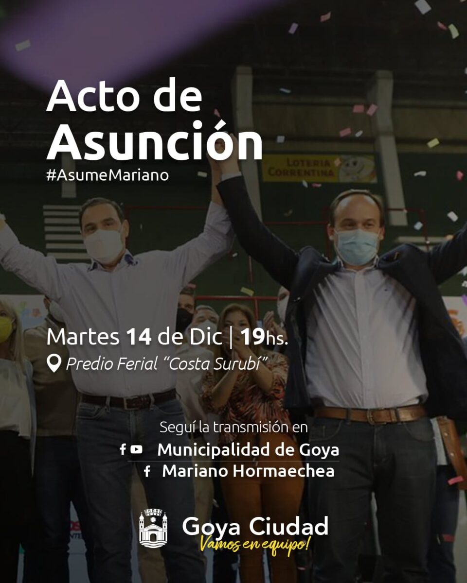 El acto de asunción contará con la presencia del Gobernador Gustavo Valdes y será transmitido por las redes oficiales del municipio.