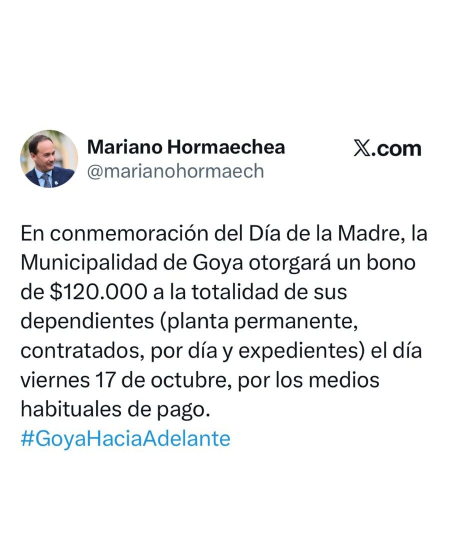 El Intendente Mariano Hormaechea a través de sus redes sociales anunció el otorgamiento de un Bono de 120 Mil Pesos, en conmemoración del Día de la Madre. Este pago será destinado a la totalidad de los dependientes del municipio Planta Permanente, Contratados, personal por Expediente y por Día, el próximo 17 de Octubre por los medios habituales de pago.