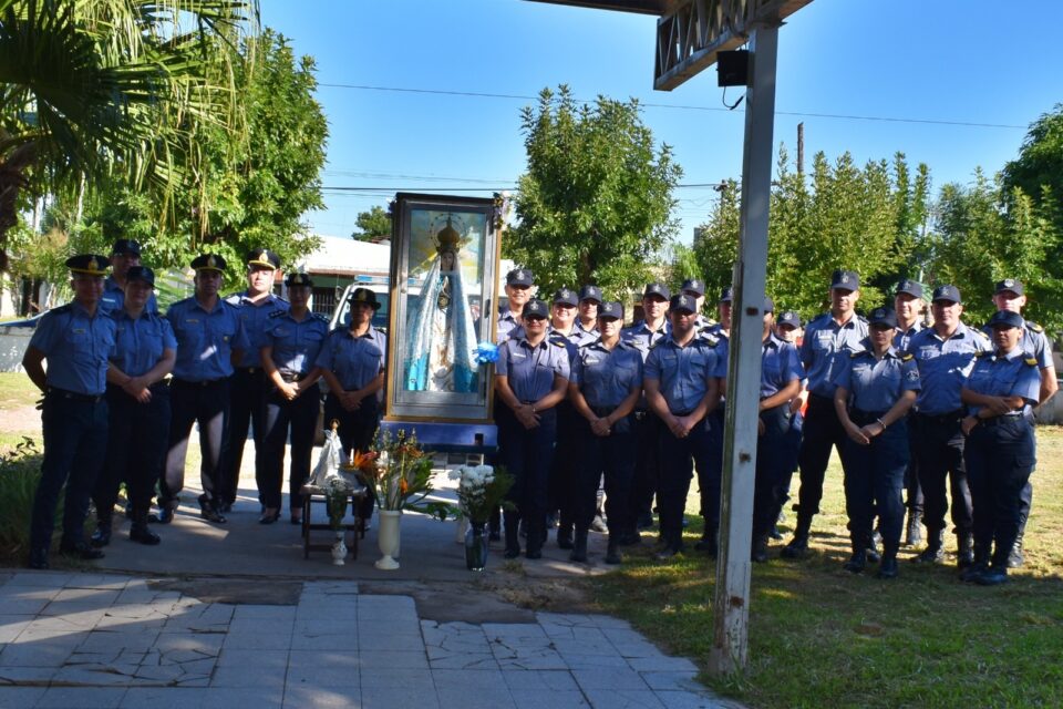 El personal policial se reunió para dar la bienvenida a la sagrada imagen, que ostenta el grado de comisario general de la institución. La ceremonia de recepción estuvo encabezada por la jefa de la dependencia, comisario inspector Carmen Errecalte, quien expresó el significado de la presencia de la Virgen en la vida de la comunidad policial.
