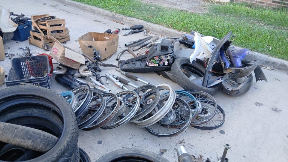 Al ingresar a la propiedad, los uniformados se encontraron con un panorama que superó las expectativas iniciales de la investigación. Secuestraron 5 motocicletas, 16 cuadros de motos (la mayoría con numeración adulterada o suprimida), 14 ruedas completas y 11 llantas, 37 bloques de cilindro, 12 caños de escape y 5 tanques de combustible.