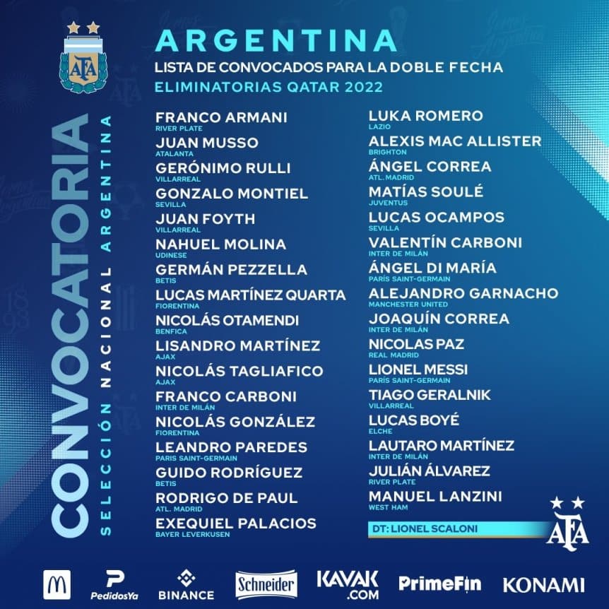 En primer lugar, se confirmó que los cuatro futbolistas suspendidos por la FIFA tras el escándalo del Brasil-Argentina (Dibu Martínez, Cuti Romero, Giovani Lo Celso y Emiliano Buendía) no fueron convocados, y tampoco llegan por lesión Marcos Acuña ni el Papu Gómez. En tanto, Paulo Dybala recién volvió a sumar minutos en los últimos días tras una lesión, pero no llegó a meterse en la consideración del DT para estos partidos. El que sí se metió, aunque al límite desde lo físico y en duda para jugar, es Ángel Di María, después de la lesión que sufrió en Real Madrid-PSG.
