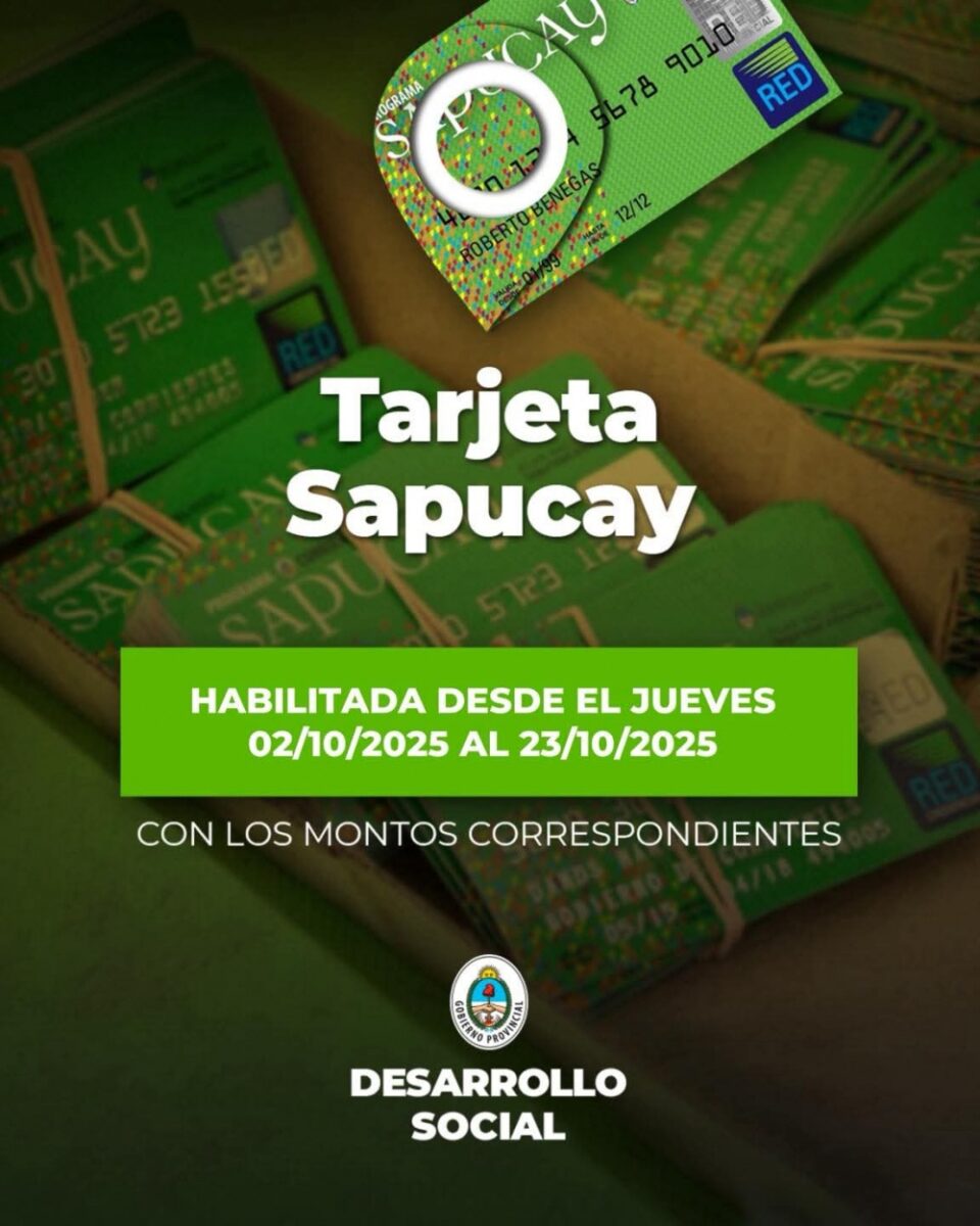 El Ministerio de Desarrollo Social de la provincia de Corrientes informó que la tarjeta Sapucay queda habilitada con los montos correspondientes a partir de este Jueves 2 de Octubre, y los beneficiarios tendrán tiempo de utilizarla hasta el miércoles 23 de Octubre de 2025.