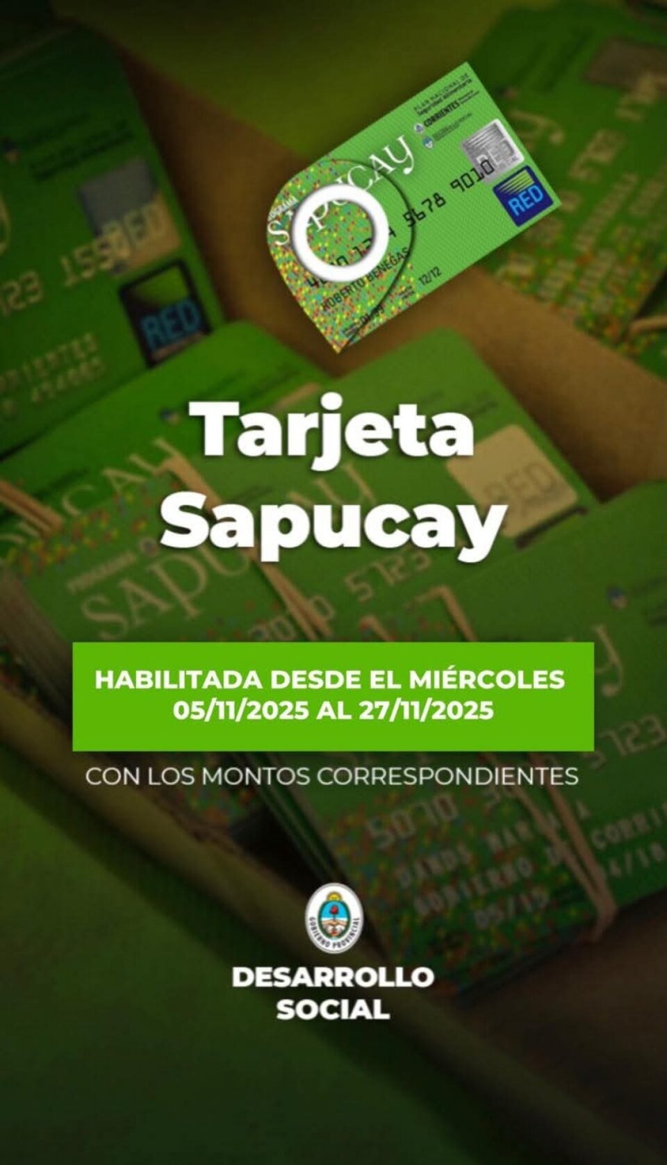 El Ministerio de Desarrollo Social de la Provincia de Corrientes anunció que la Tarjeta Sapucay estará habilitada desde este Miércoles 5 hasta el Jueves 27 de Noviembre de 2025. Durante ese período, los beneficiarios podrán realizar sus compras en los comercios adheridos, utilizando los montos correspondientes establecidos por el programa.