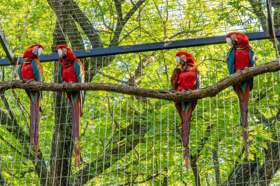 La vida de estos guacamayos rojos inicia en Escobar, Provincia de Buenos Aires. Aquí, en el BioParque Temaikèn, se emparejaron a los progenitores y luego se supervisó el correcto desarrollo de los pichones, que son criados exclusivamente para el proyecto de reintroducción de la especie en Iberá. Luego estos individuos pasaron un período de cuarentena y entrenamiento de vuelo en nuestras instalaciones del Centro de Conservación Aguará, en Paso de la Patria, Corrientes.