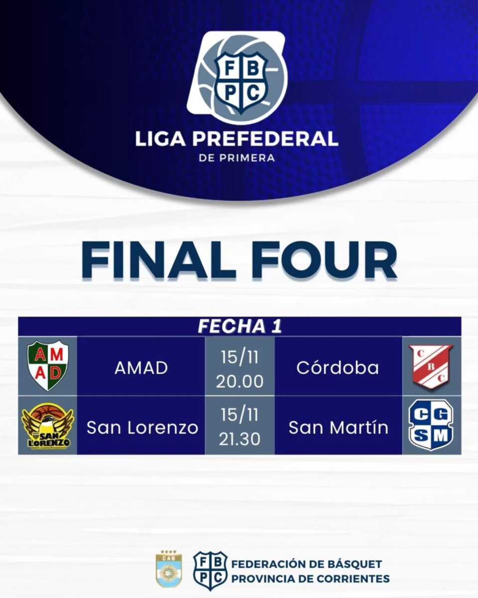 Desde el próximo viernes en la ciudad de Monte Caseros se pondrá en juego el Final Four de la Liga Prefederal de Básquet organizado por la FBPC, donde el local San Lorenzo oficia de anfitrión de AMAD de Goya, San Martin de Curuzu Cuatia y Club Córdoba de Corrientes Capital.