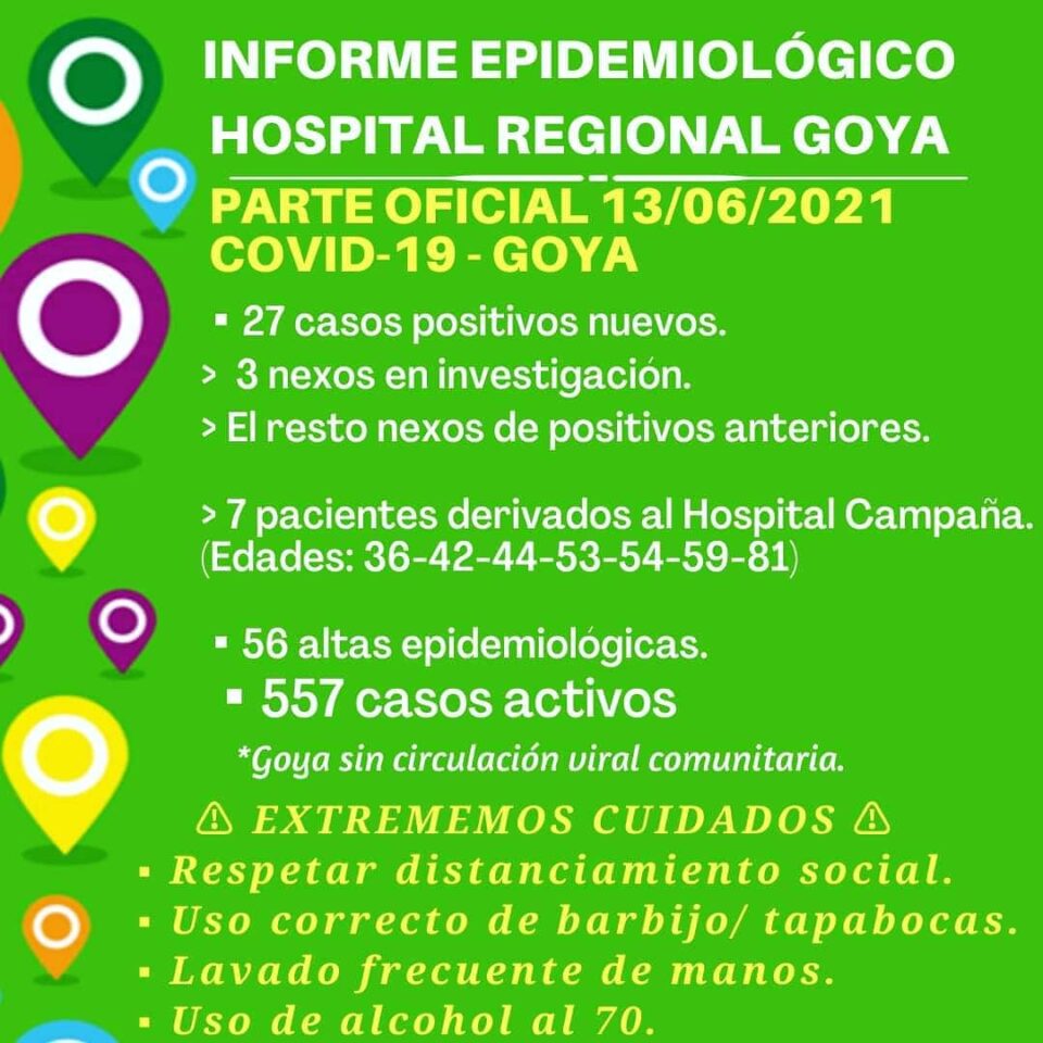 En las ultimas 24 horas se registraron en nuestra ciudad 27 casos de covid-19, esta cifra marca un descenso importante de casos respecto a lo que venia marcando con cifras de un promedio de 50 casos diarios. 7 goyanos necesitaron internación y fueren derivados al Hospital de Campaña.