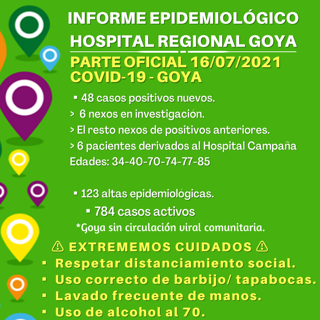 Por segunda jornada consecutiva Goya registra menos de 60 casos en 24 horas. Este viernes fueron 48 los contagios detectados lo que con 123 altas epidemiológicas otorgadas, quedan un total de 784 casos activos.