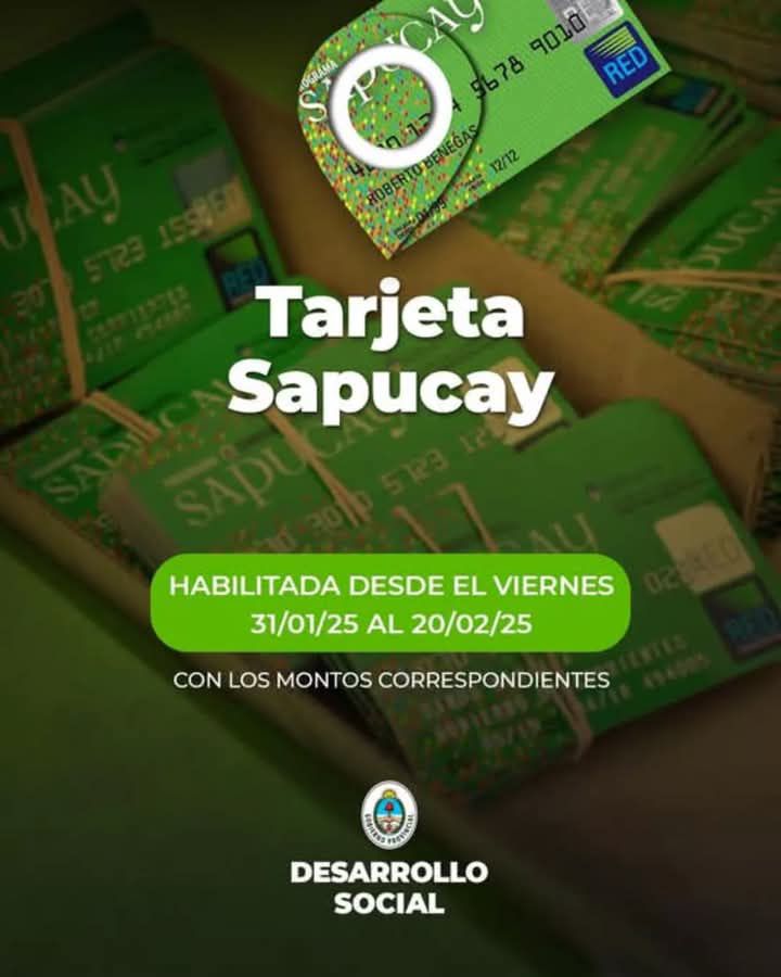 El anuncio lo realizó el Ministerio de Desarrollo Social, a cargo de Adán Gaya, a través de sus canales oficiales. Anunciaron que a partir de este Viernes 31 de Enero se habilitará la Tarjeta Sapucay y será válida hasta el 20 de febrero de 2025. Todas, con sus montos correspondientes.