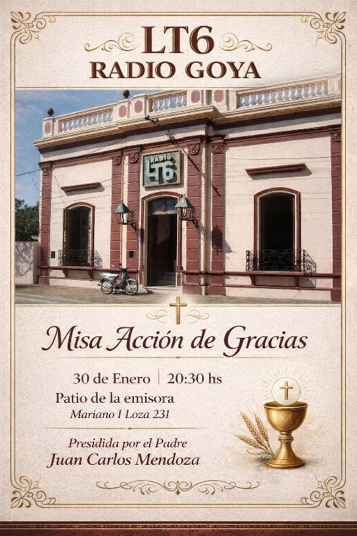 El personal de la emisora, invita a participar de la misa de acción de gracias por el 73° Aniversario de la radio, a celebrarse este Viernes 30 a las 20.30 horas, presidida por el Padre Juan Carlos Mendoza, Párroco de nuestra señora de Itatí y Vicario General de la Diócesis de Goya. En el patio de verano de la emisora, Mariano I Loza 231. Una tradición de poner en manos de Dios, la vida y las acciones de los trabajadores de este medio de comunicación”.