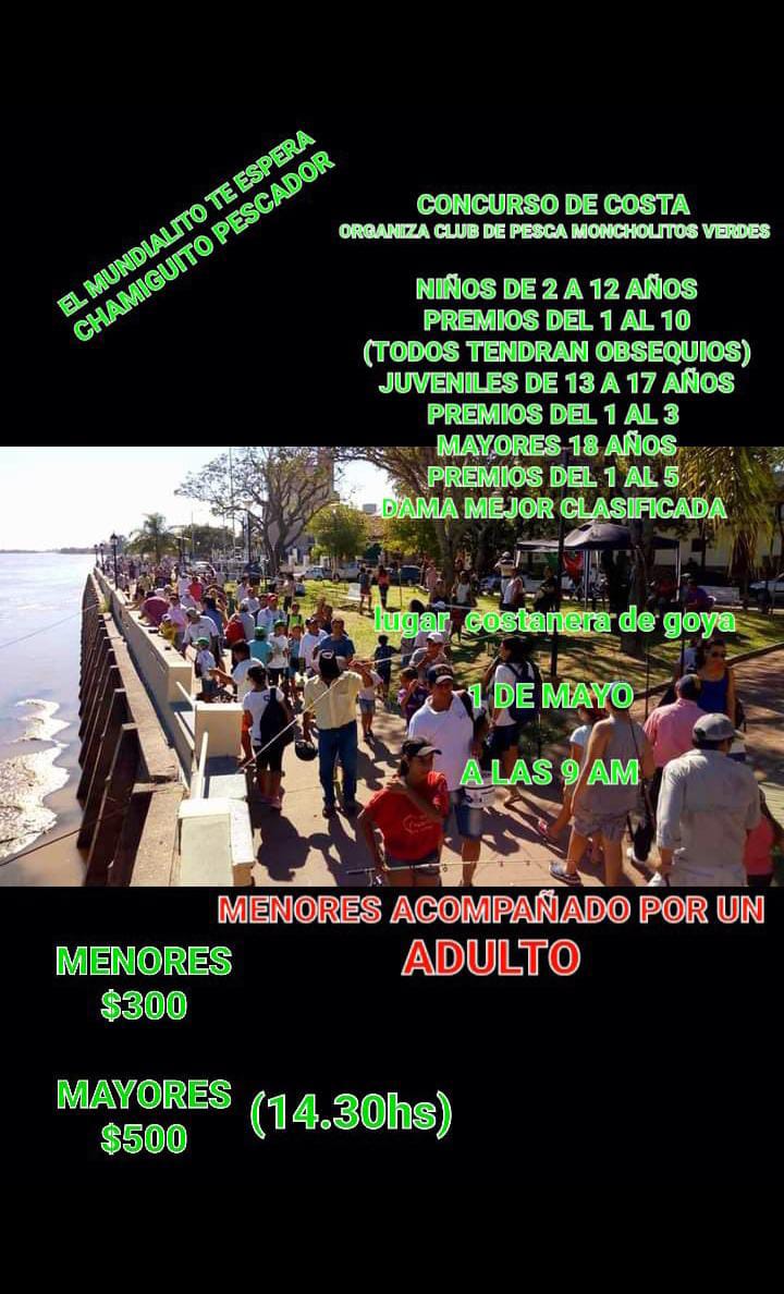 Los integrantes del club de pesca “Moncholitos Verdes”, hicieron saber que se encuentran organizando un concurso de pesca de costa para jóvenes y chicos a realizarse en la costanera de Goya. Las categorías serán niños (2 a 12 años), juveniles (13 a 17 años) y mayores (18 años). Lo menores deberán asistir acompañado por un mayor. Inscripción menores $300,00 y mayores $ 500,00.