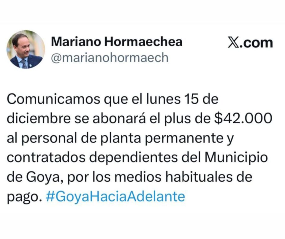 El intendente municipal de Goya, doctor Mariano Hormaechea anunció que se acreditará el plus de 42.000 pesos al personal de planta permanente y contratados del municipio este Lunes 15 de Diciembre y se verán reflejados en los medios habituales de pago.