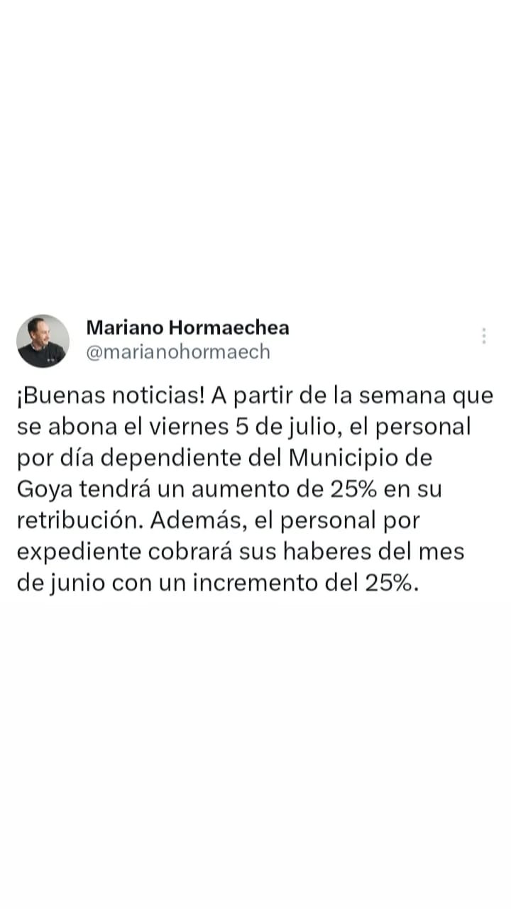 En su mensaje el jefe de la comuna Mariano Hormaechea anunció: ¡Buenas noticias! A partir de la semana que se abona el viernes 5 de julio, el personal por día dependiente del Municipio de Goya tendrá un aumento de 25% en su retribución. Además, el personal por expediente cobrará sus haberes del mes de junio con un incremento del 25%.