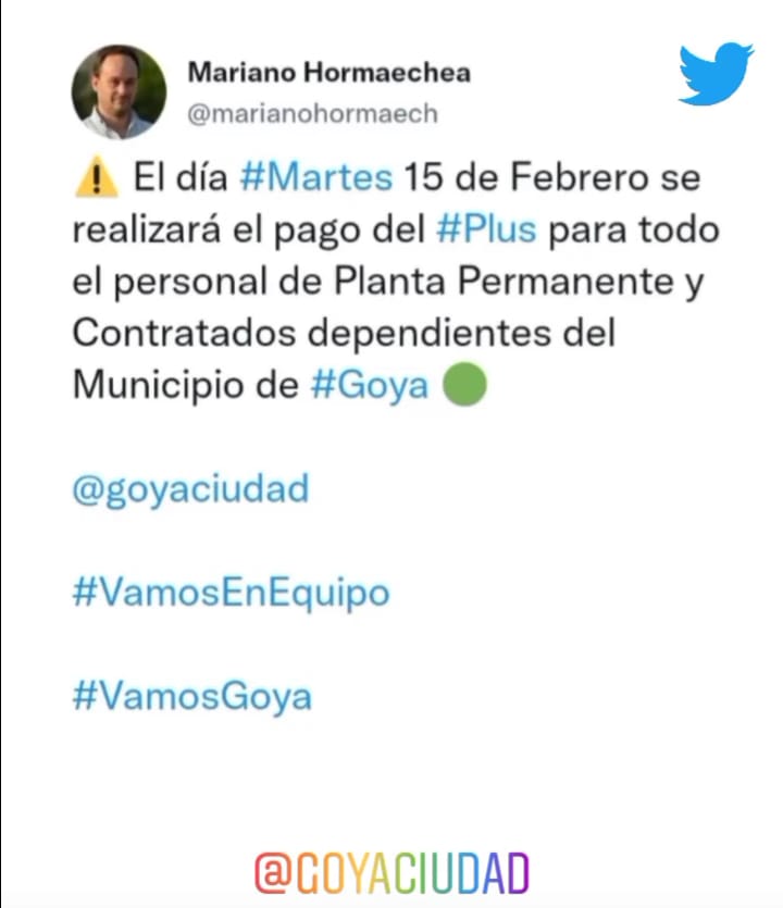 El martes 15, la Municipalidad abonará el plus salarial de 16 mil pesos correspondientes al mes de febrero a la totalidad de los empleados de Planta Permanente y Contratados, el cual estará disponible en los lugares habituales de pago.