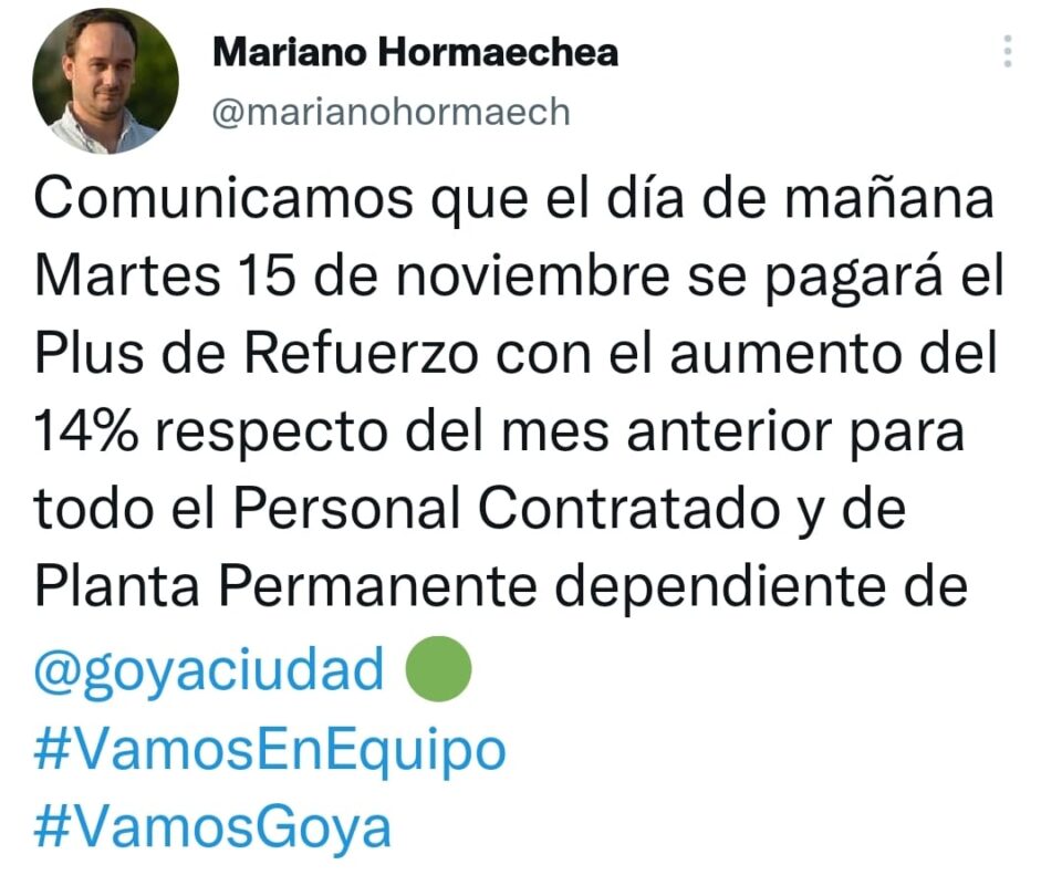 NoticiasMunicipio de Goya paga plus con aumento 14 noviembre, 2022 El Intendente Mariano Hormaechea anunció en sus redes que este martes 15 se concretará el pago del plus a los agentes municipales con un 14% de aumento.