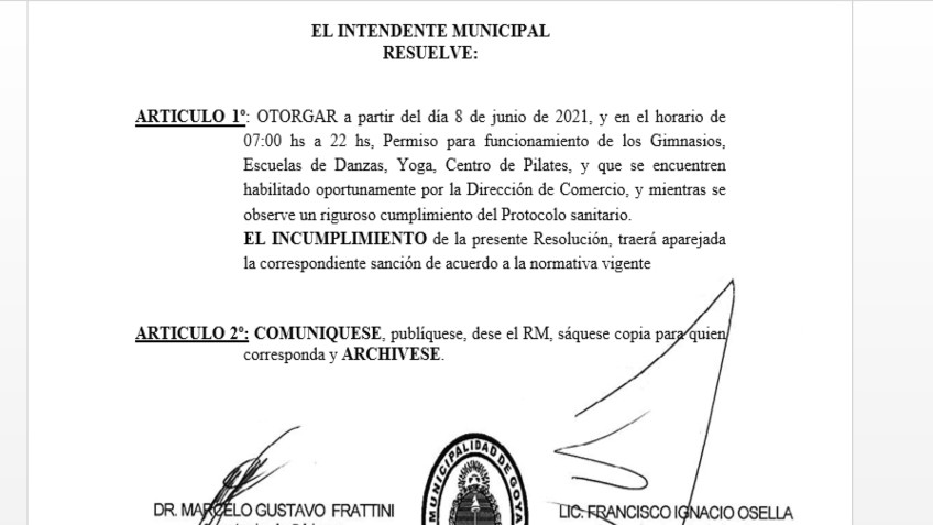 Por medio de la Resolución 1.145, que lleva las firmas del Intendente Francisco Ignacio Osella y del secretario de Gobierno, Marcelo Frattini con fecha 8 de junio, el municipio establece la apertura de gimnasios, institutos y/o escuelas de danzas; yoga y pilates.