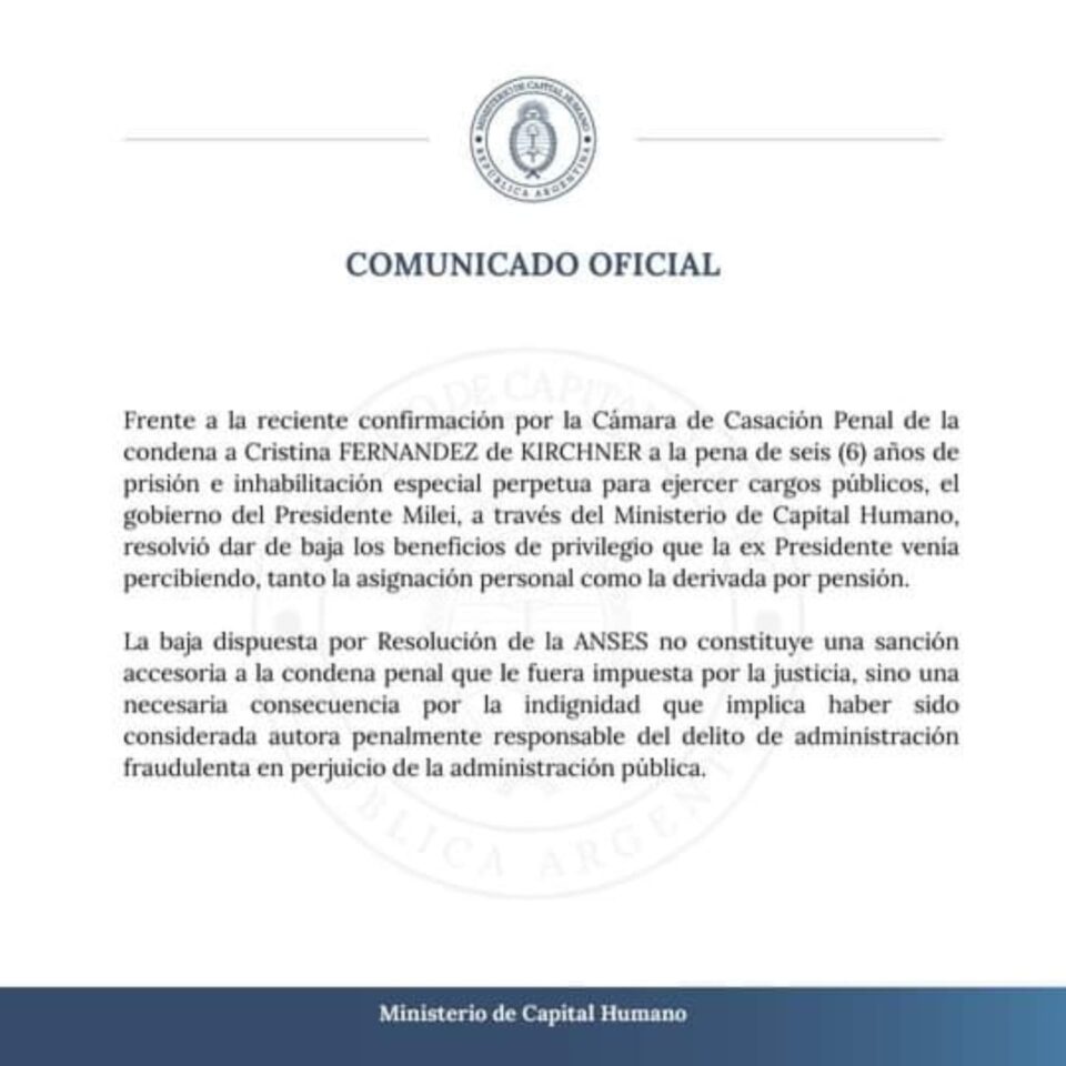Desde el ministerio de Capital Humano, del que depende la ANSES, expresaron en un comunicado: “Frente a la reciente confirmación por la Cámara de Casación Penal de la condena a Cristina Kirchner a la pena de seis (6) años de prisión e inhabilitación especial perpetua para ejercer cargos públicos, el gobierno del Presidente Milei, a través del Ministerio de Capital Humano, resolvió dar de baja los beneficios de privilegio que la ex Presidente venía percibiendo, tanto la asignación personal como la derivada por pensión”.
