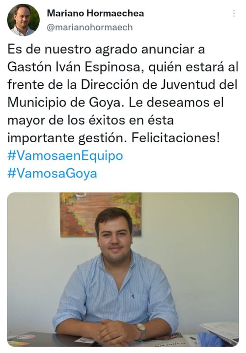 A través de su cuenta de Twitter, el Intendente Municipal Mariano Hormaechea dio a conocer en la mañana de hoy los nombres de las personas que estarán al frente de las Direcciones de Turismo y de Juventud.