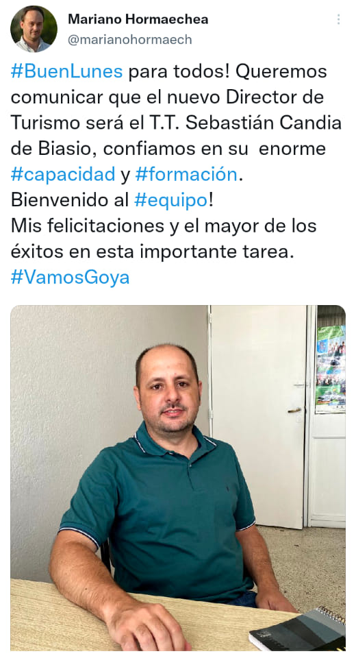 En el primer caso, la designación recayó en el Técnico en Turismo Sebastián Candia Di Biasio. “Confiamos en su enorme capacidad y formación” para esta “importante tarea”, destaca en el tuit en que formalmente le da bienvenida al equipo.