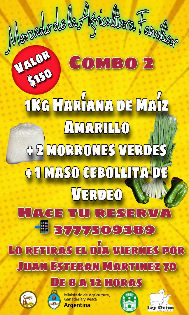 Combo 2: Valor 150 pesos, contiene: 1 Kilogramo de Harina de Maíz Amarillo, 2 Morrones y 1 Mazo de Cebollita en Verdeo.